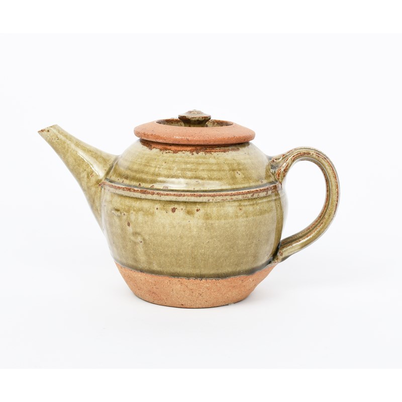 a stoneware teapot and cover, covered to the foot with an ash glaze,