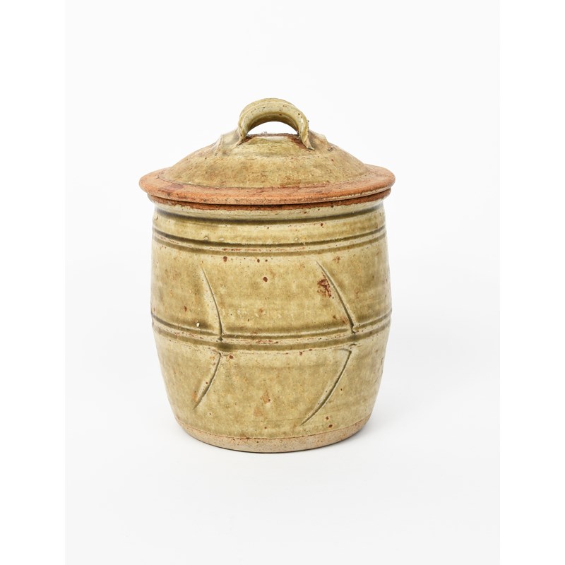 a stoneware sugar jar and cover, with incised chevron motif, glazed to the foot with an ash glaze,