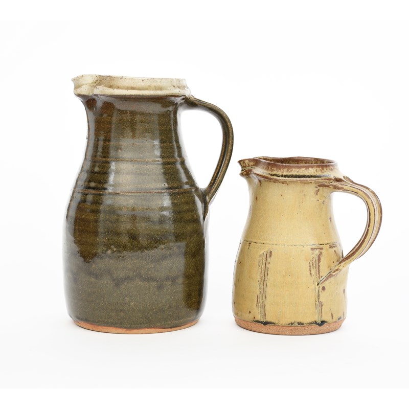 a stoneware jug, covered to the body with an olive green glaze, the rim celadon ash, and another jug by Richard Batterham,