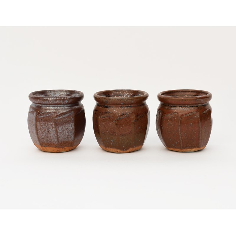a small cut-sided stoneware vase, covered in a tenmoku glaze, and two others similar,