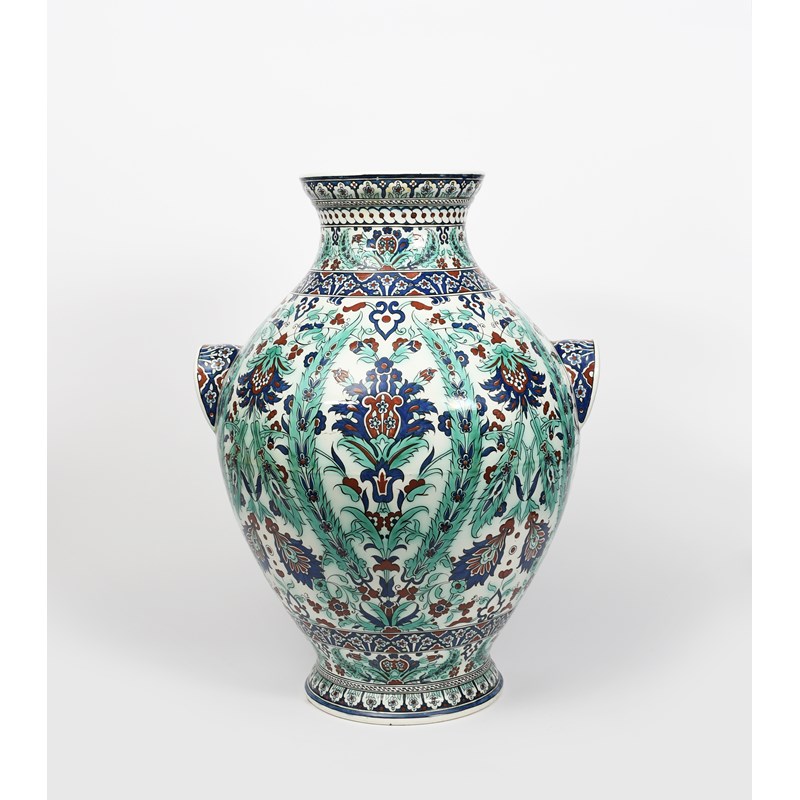 A monumental Boch Freres Keramis Iznik vase, model no.69, shouldered form with twin lug handles, painted with flowers and foliage panels in turquoise, blue and red on a white ground, between foliage bands, painted BFK, TE monogram, 69, minor professional restoration to one handle, 75cm. high