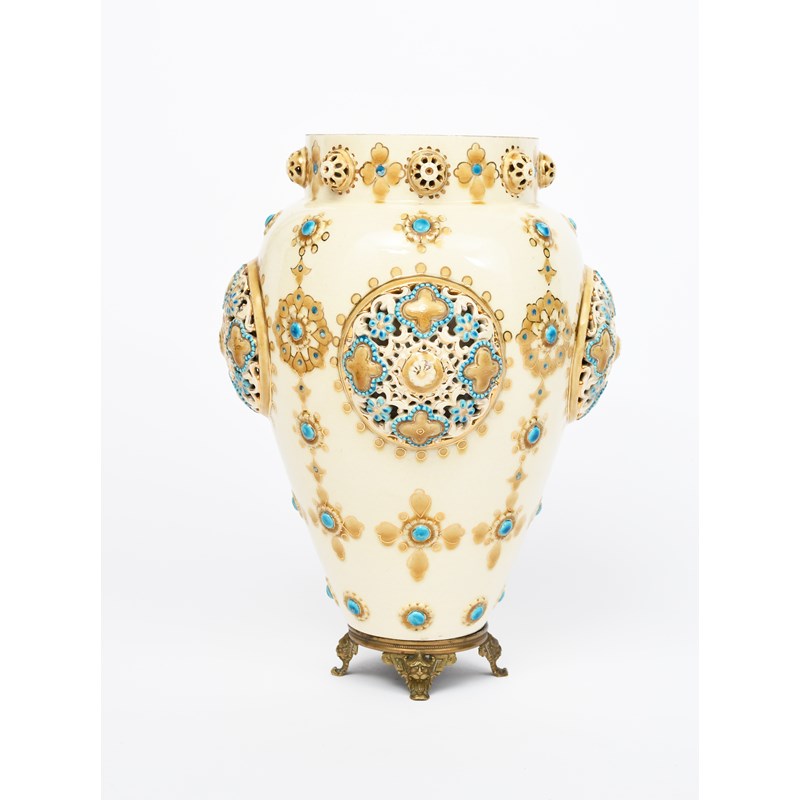 A Zsolnay Pecs pottery vase, swollen, shouldered form with collar rim, applied with raised and pierced roundels, glazed in turquoise, and tan on a buff ground, with gilt highlights, on applied gilt metal foot cast in relief with lion heads, Zsolnay Pecs marks concealed under base, 30cm. high
