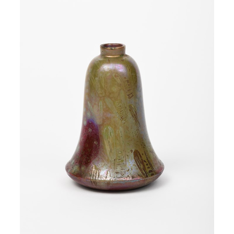 An Art Nouveau Delphin Massier Vallauris vase, solifleur form, with tapering body, painted with wasps in golden iridescence over red lustre ground, signed Delphin Massier Vallauris, minor glaze frits, 12.5cm. high