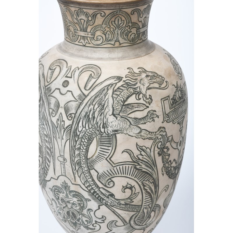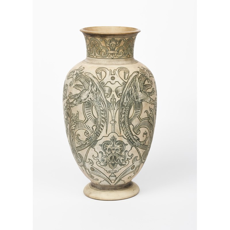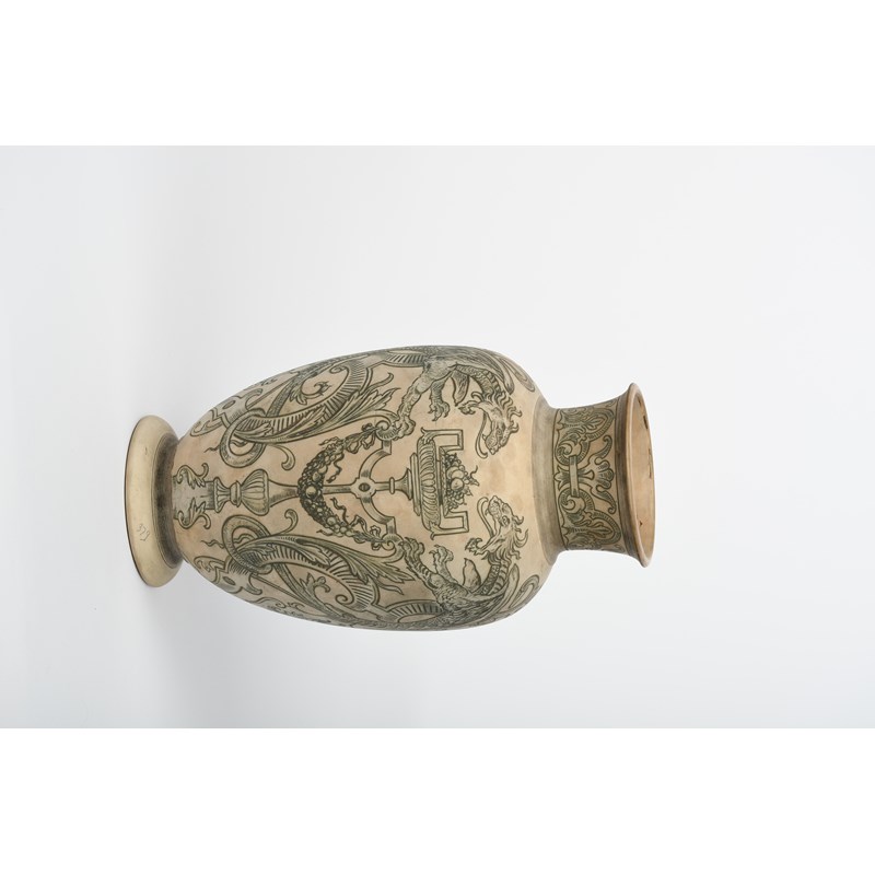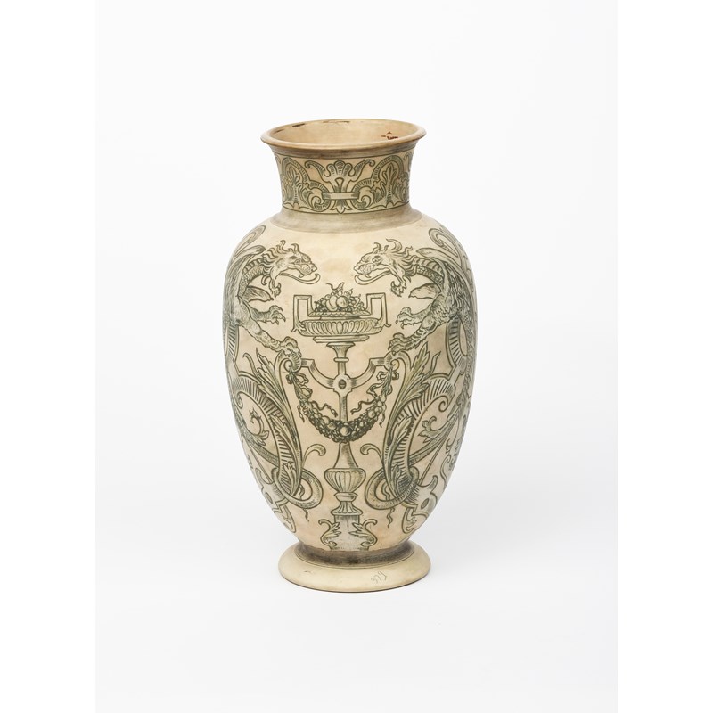 A Martin Brothers stoneware Dragon vase by Edwin & Walter Martin, dated 1896, baluster form, incised and painted in black with grotesque dragons flanking classical urns, on a buff ground, unglazed, incised 1-1896 Martin Brothers London & Southall, 34.5cm. high