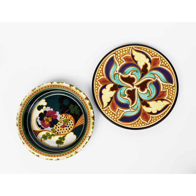 A Gouda Pottery Nova wall plate, painted with radiating foliate panels in blue, turquoise yellow and red, inside a black rim, and a Gouda Juliana bowl with inverted rim, painted marks, 27.5cm. diam. (2)
