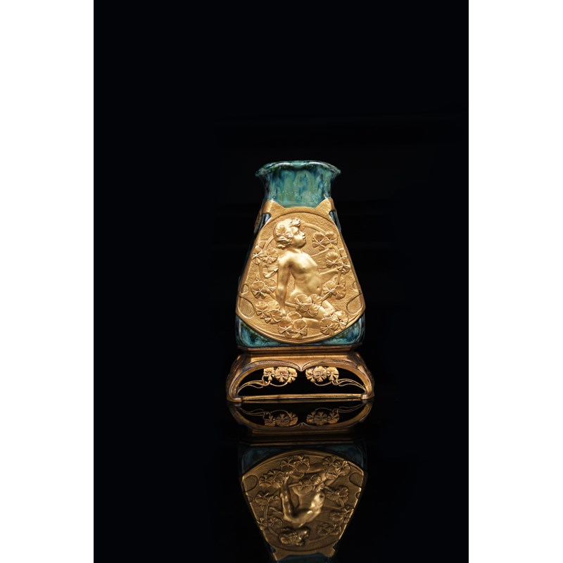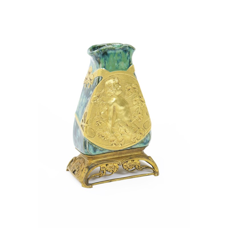An Art Nouveau porcelain vase on gilt bronze mount by Charles Korschann, the tapering body with square aperture, cast in low relief with a panel of a child amongst scrolling flowers and strapwork, the reverse with Secessionist panel,