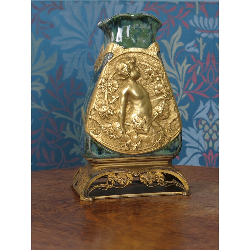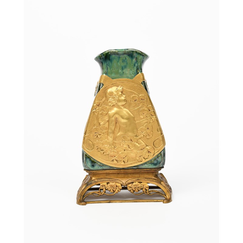 An Art Nouveau porcelain vase on gilt bronze mount by Charles Korschann, the tapering body with