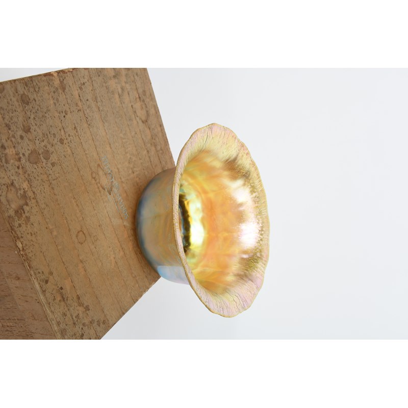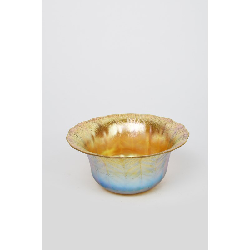 A Louis Comfort Tiffany Favrile glass bowl in presentation box, fluted form with golden iridescence,