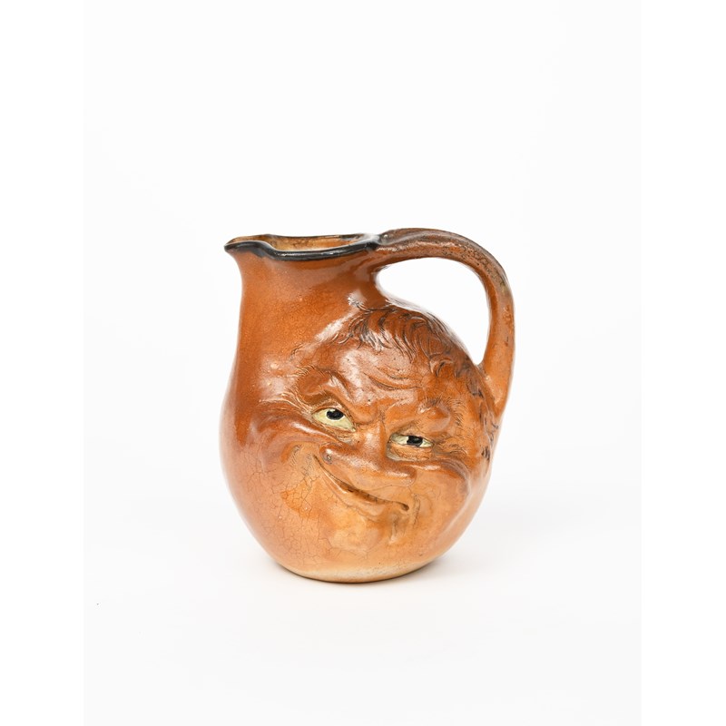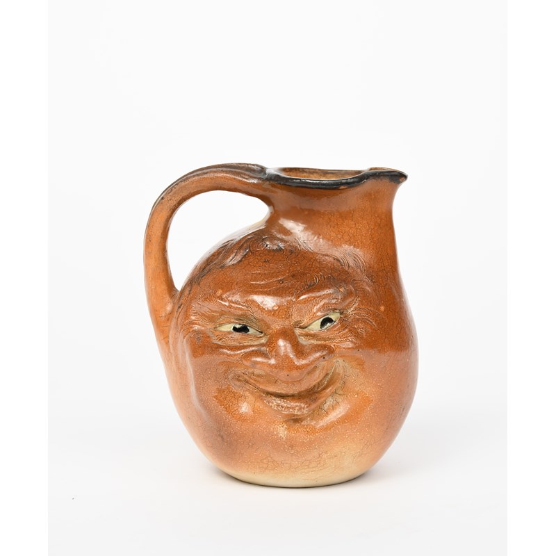 A Martin Brothers salt-glaze stoneware face jug by Robert Wallace Martin, dated 1899, modelled in relief to one side with a smiling, smirky grin, the reverse with a simple smile, glazed tan and ochre, highlighted with white and black, incised 5-1899 Martin Bros, London & Southall, professional restoration to top rim, 19.5cm. high