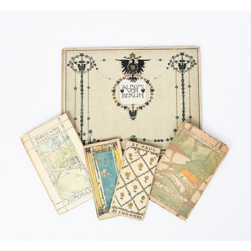 The Spell of the Open Air and St Paul two books with covers designed by Jessie M King, published by Turnbull & Spears, 'Album From Berlin' published and two version of 'memories' by Robert Louis Stevenson, all with covers designed by Jessie M King, (5)