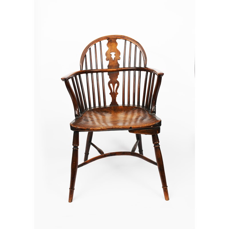 A Windsor armchair, the back with carved central splat, with crinoline stretcher, unsigned, 87cm. high