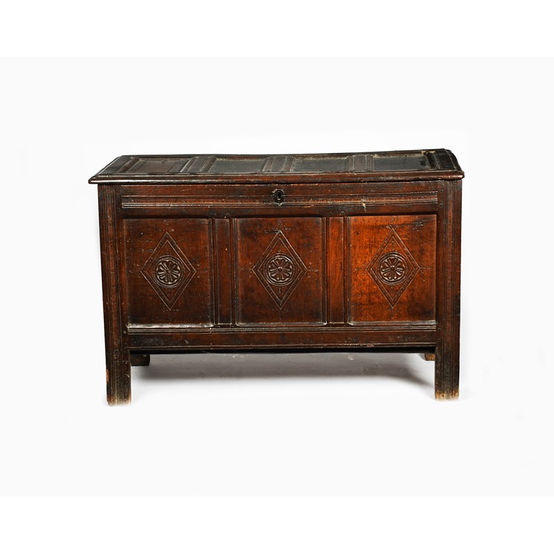 A 17th/18th century oak three panel coffer, with hinged top, carved with diamond shaped panel