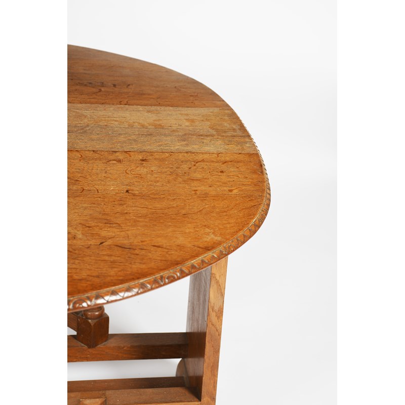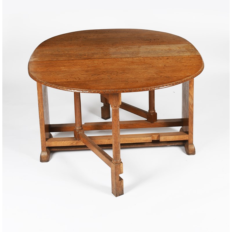 A Heal's oak gate-leg table designed by Ambrose Heal, made as a wedding present for his son Anthony in 1941, the hinged top with chip-carved border to edge,
