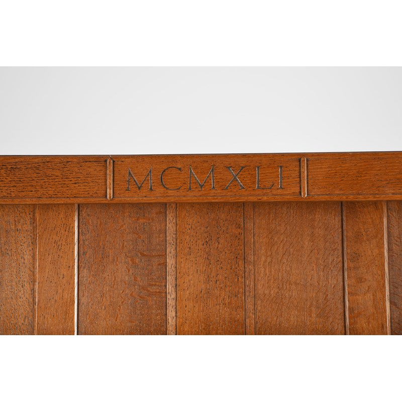 A Heal's oak dresser designed by Ambrose Heal, made as a wedding present for his son Anthony in 1941, carved panel doors below drawers, below panelled, shelved top with turned wooden peg hooks, carved inscriptions, paper label to drawer,