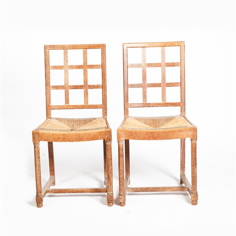 A pair of Heal's limed oak chairs, 1925, open trellis back, drop in rush seats, on turned front legs, with H stretcher, unsigned, 87.5cm. high (2)