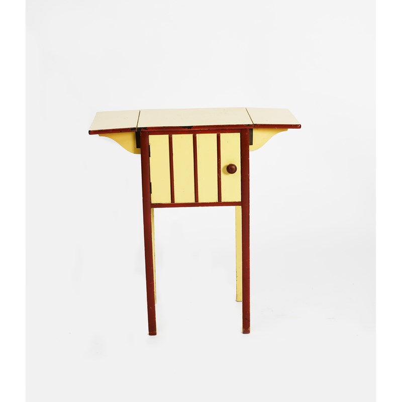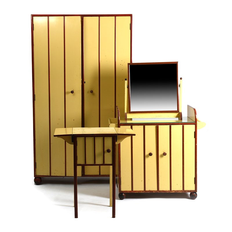 A Heal & Son painted wood bedroom suite, comprising a two-door wardrobe, washstand, dressing-table mirror, bedside table with side flaps, painted red and yellow, on ball feet, unsigned, 184 x 107cm (wardrobe), (4)