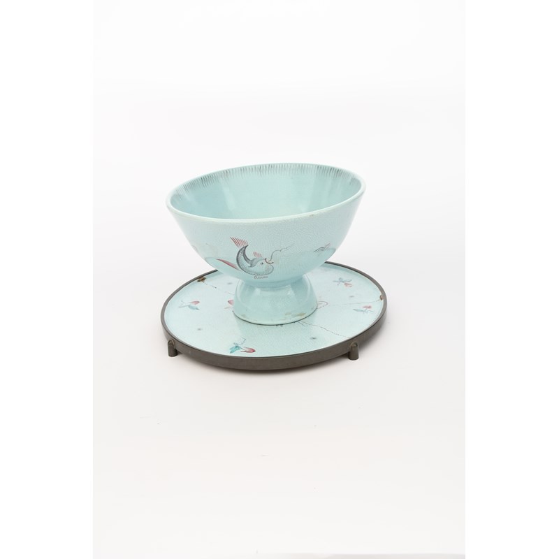 An Arabia Finland pottery pedestal bowl by Greta Lisa Jaderholm-Snellman, dated 1936, painted with stylised fish in black and red on a pale blue ground, and an Arabia pewter mounted tray by Greta Lisa Jaderholm-Snellman painted with stylised flowers, painted factory marks and monogram to bowl dated 1936, tray broken and rivetted, 30cm. diam,