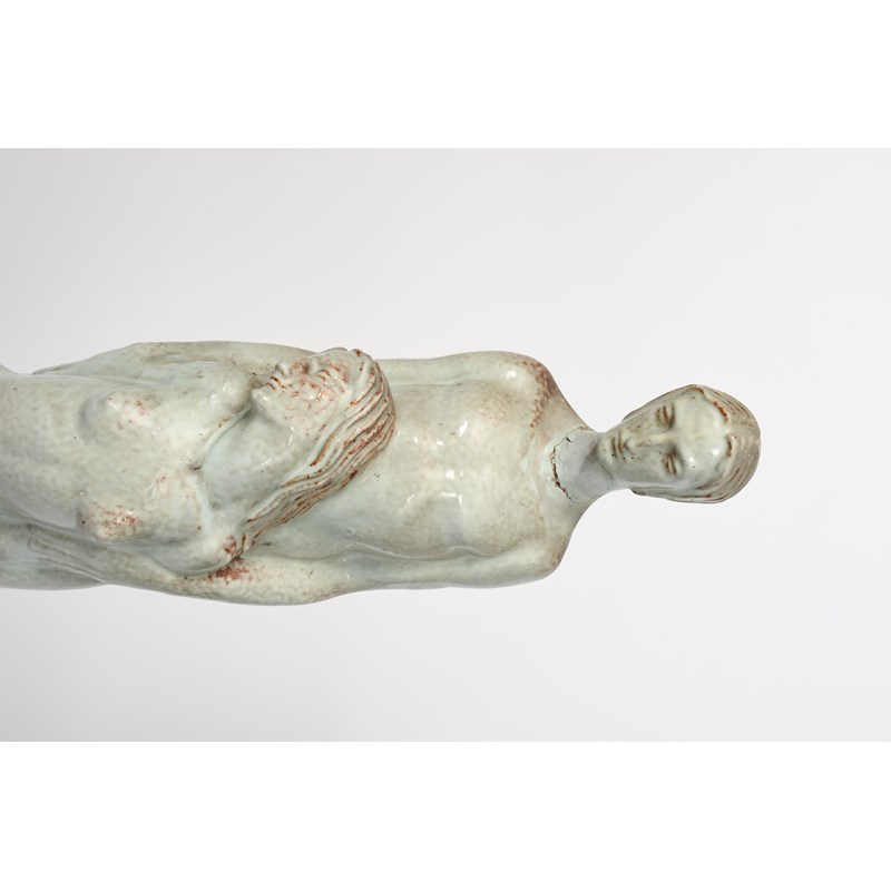 a pottery sculpture, glazed in pale blue and rust