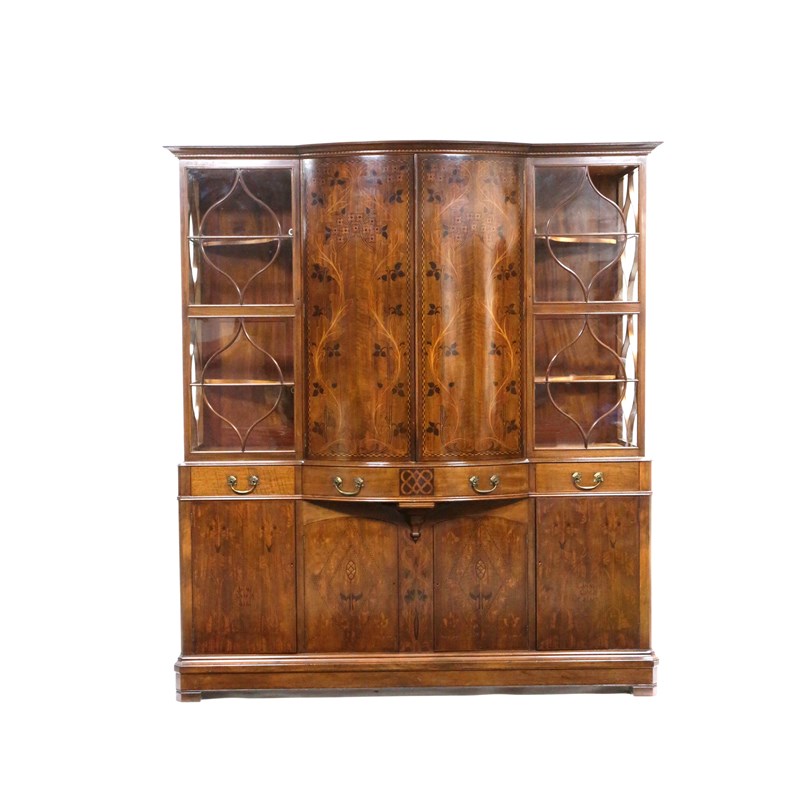 A Morris & Co inlaid Italian walnut cabinet designed by George Jack, model no.554, glazed cabinets with hinged doors flanking central bow-fronted cabinet, the doors with inlaid stylised flowers and foliage, above drawers and a central bow-fronted cabinet, patinated metal furniture
