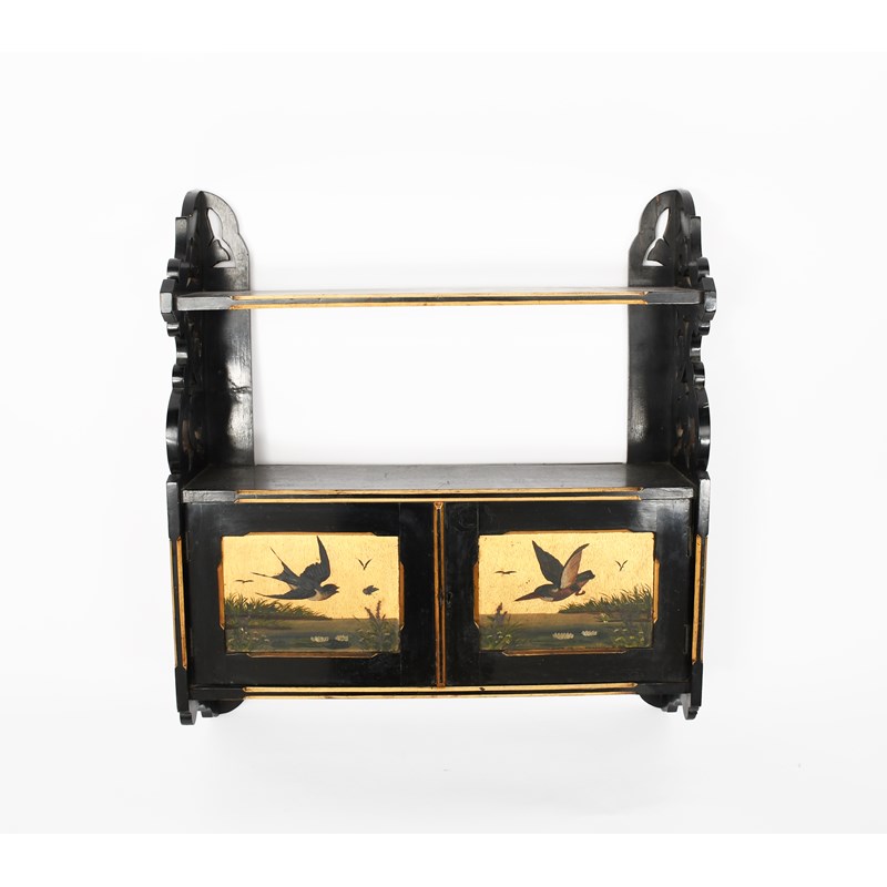 A small Aesthetic Movement hanging wall cabinet, rectangular two door compartment, painted with panels of birds flying, swallows and a kingfisher, over a river landscape, in colours on a gilt ground, under two shelves, unsigned, 58cm. wide. 65cm. high