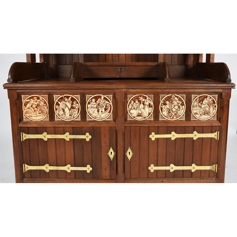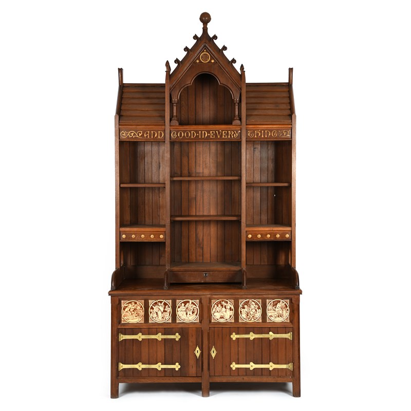 A large Reformed Gothic oak cabinet, twin cupboard with hinged doors, with a panel of six Minton tiles by John Moyr Smith, supporting tall bookcase with pitched roof, inscribed And Good in Everything, Oct 1st 1974, in gilt, with polished brass furniture, 124cm. wide, 62cm deep, 246 cm. high