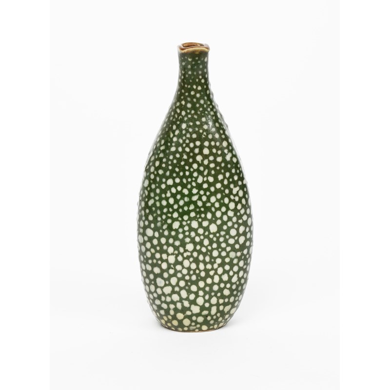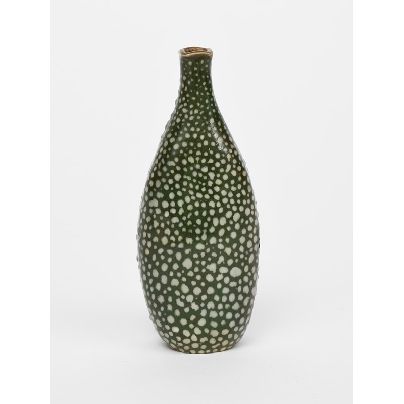 A Martin Brothers stoneware gourd vase by Edwin and Walter Martin, dated 1911, shouldered, flat form with solifleur neck, painted with white spots on a green ground, incised 6-1911 Martin Bros London & Southall, minor burst air bubbles, 12.5cm. high