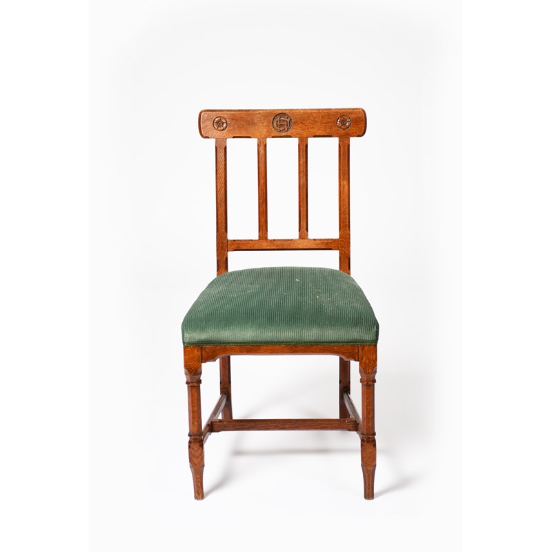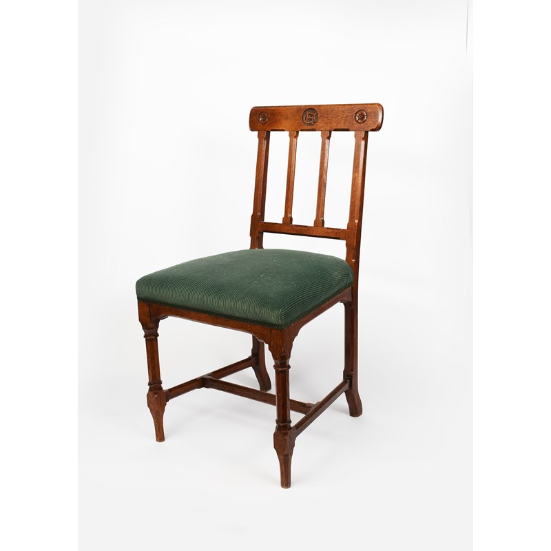An oak chair designed by Augustus Welby Northmore Pugin, carved octagonal legs, with H stretcher, the tapering, angled back supports with simple shaped rectangular rest, carved with central CH roundel flanked with flowerhead roundels, 88cm. high