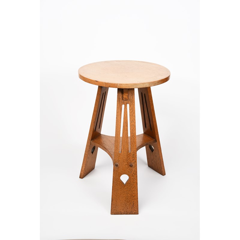 A Liberty & Co oak occasional table, circular top with flaring tripod legs, with pierced dash and dew drop decoration, applied paper label, 44.5cm. diam, 64cm. high.