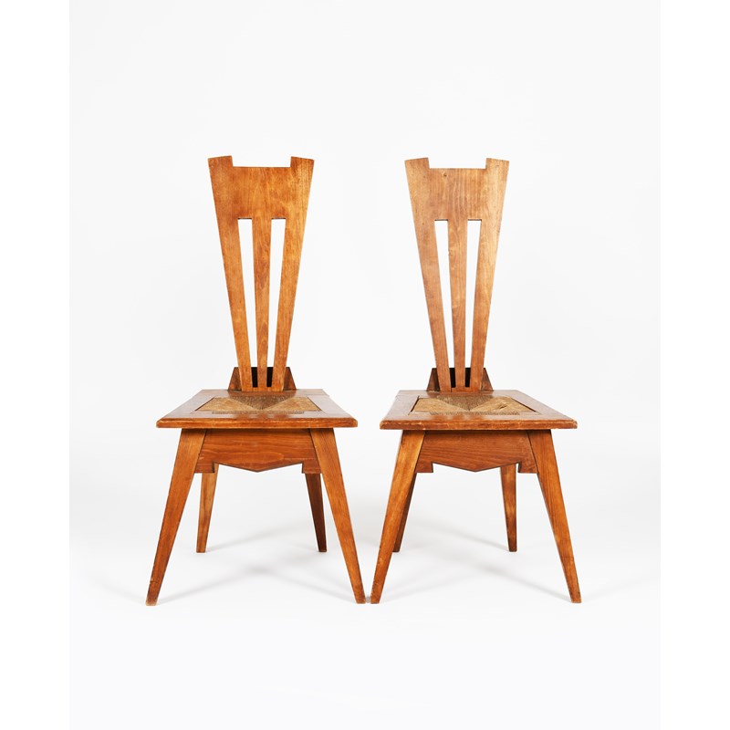 A pair of Liberty & Co oak Wyclif chairs designed by Leonard Wyburd, angular form with drop in
