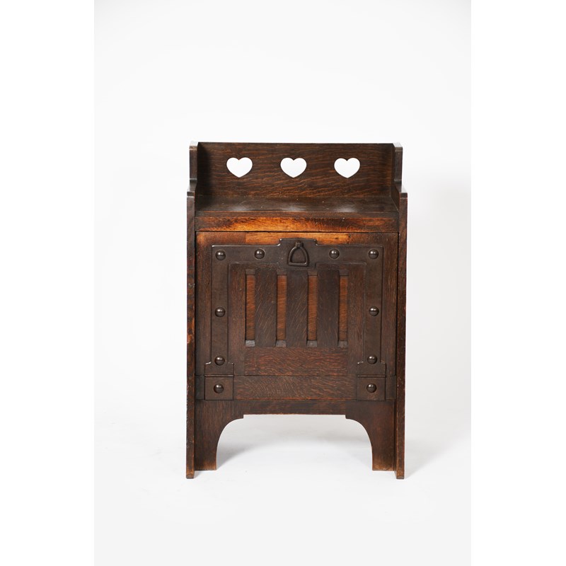 A Liberty & Co oak coal cupboard, tapering, rectangular section, with cut-out heart decoration,