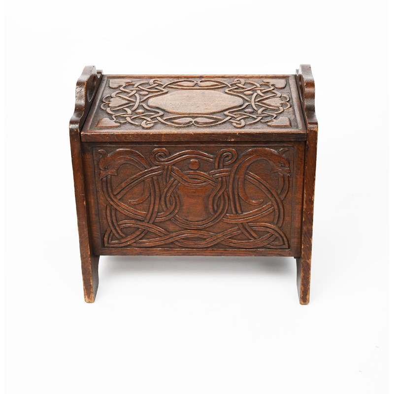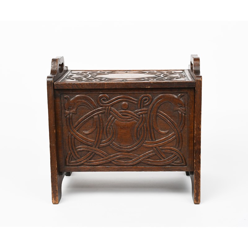 An oak coffer or shoe box the design attributed to Alexander Ritchie of Iona, tapering rectangular form, carved with panels of Celtic knot decoration, the end panels with mythical dragons and heart shaped foliage, with pierced handles, unsigned, 45.5cm. high