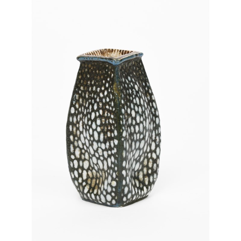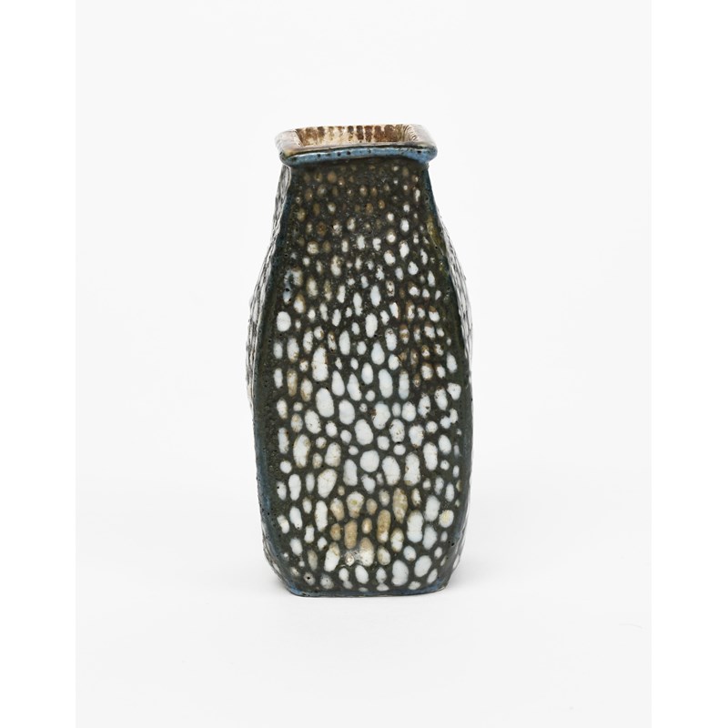 A Martin Brothers stoneware gourd vase by Edwin and Walter Martin, dated 1900, shouldered, square section, painted with white spots on a green ground, incised 1900 Martin Bros, London & Southall, 9.2cm. high