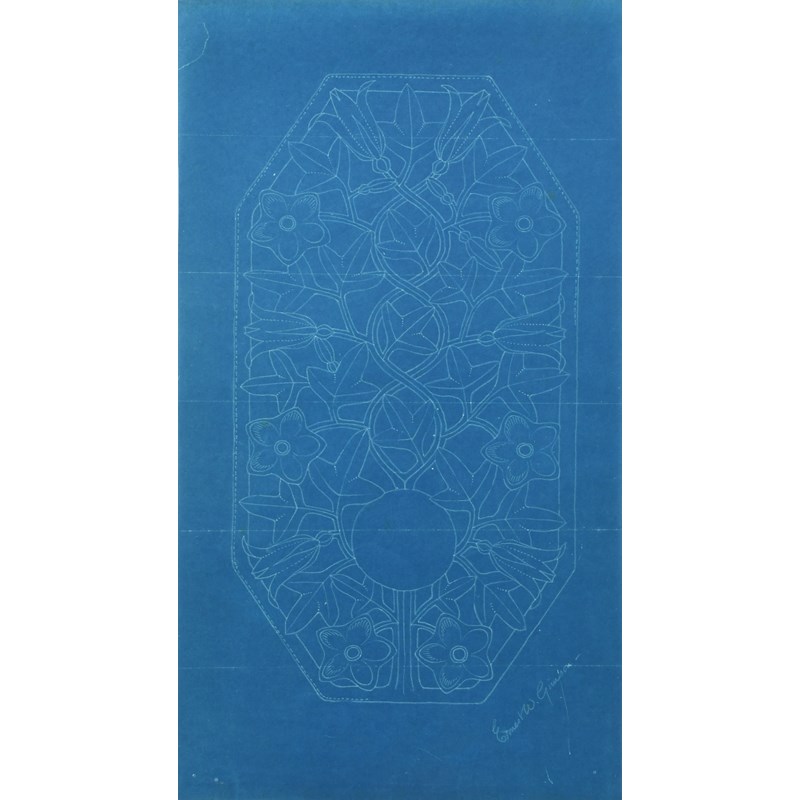 blue-print on paper, depicting an octagonal backplate with pierced flowers and foliage design