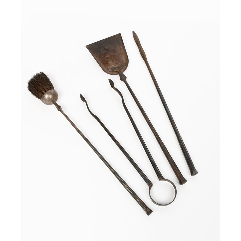 A set of Cotswolds school wrought steel fire tools by Norman Bucknell, comprising; shovel, brush,
