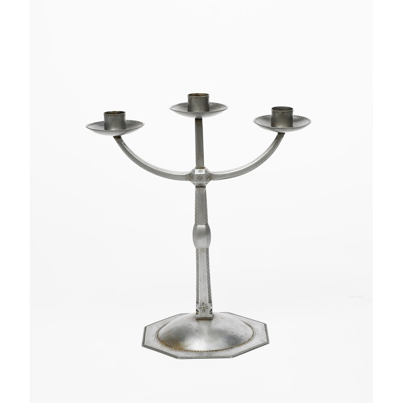 A steel three branch candlestick designed by Ernest Gimson, octagonal, domed base with knopped tapering central stem, with punched decoration, unsigned, 33.5cm. high