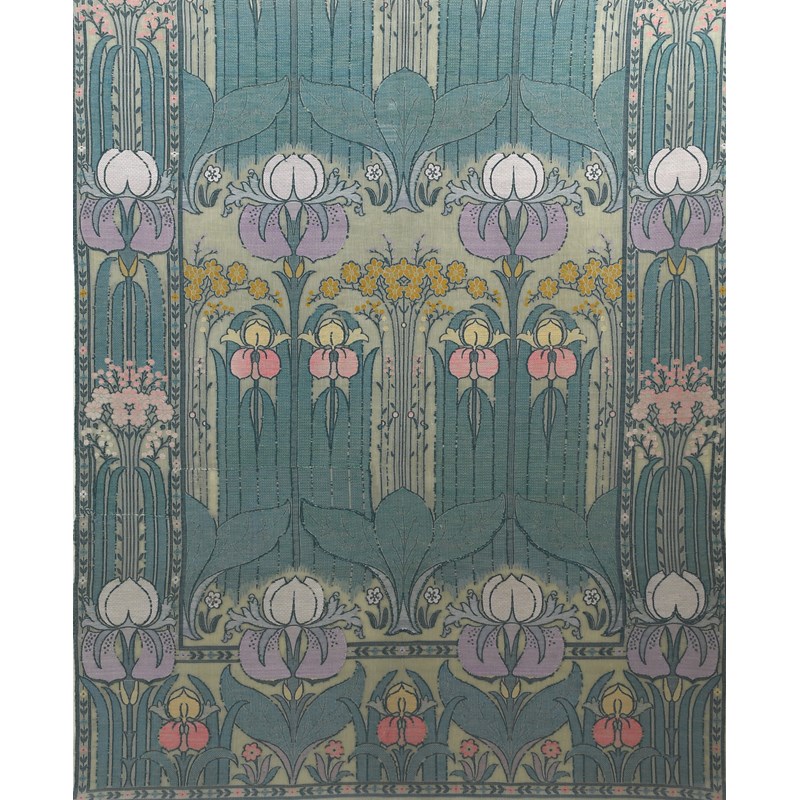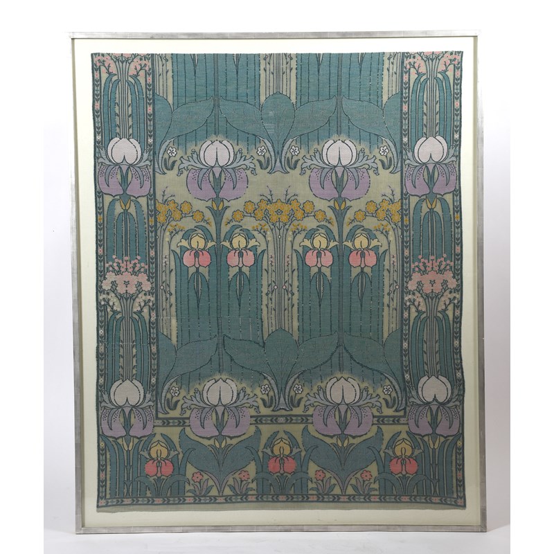 A large Morton Sundour woven wool gauze textile panel designed by Gavin Morton, woven with flag iris in purple, inter-spaced with yellow and pink wild flowers with Art Nouveau linear foliage, repeat design, in pastel colours, framed and mounted