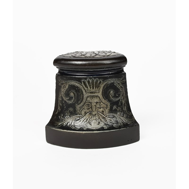 A Martin Brothers stoneware kerb corner stone, incised with a shield mask with scrolling foliage, glazed brown and grey, unsigned, 13.5cm. high