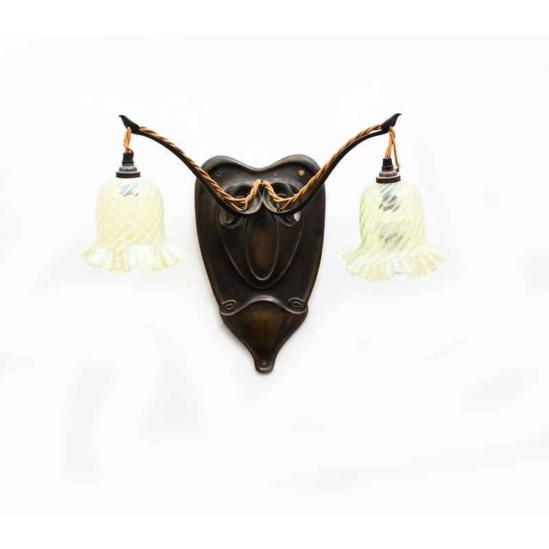 A pair of patinated bronze wall sconces, the shield shape backs cast with scroll motif, twin-branch lights with foliate terminals, with engraved vaseline glass shades, 32cm. high (2)