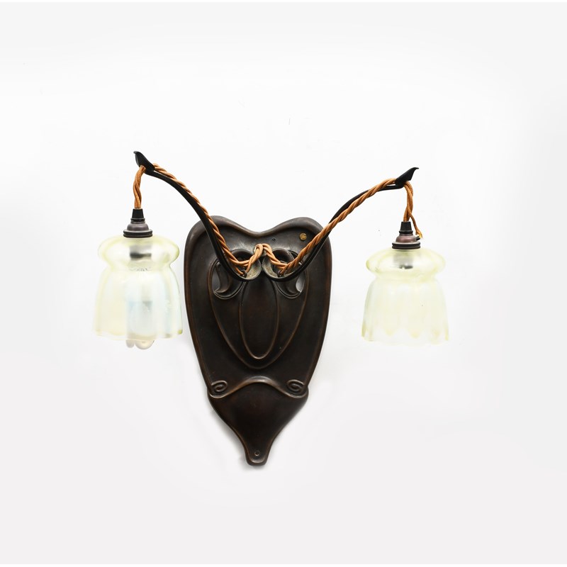 A pair of patinated bronze wall sconces, the shield shape backs cast with scroll motif, twin-branch