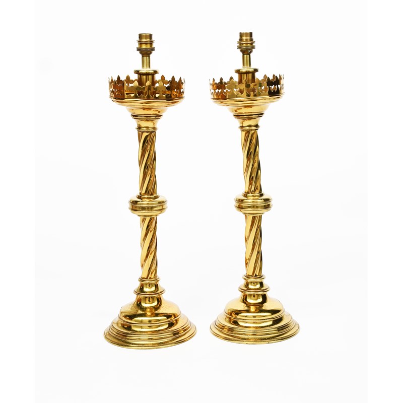 A pair of Reformed Gothic brass candlesticks, stepped domed bases supporting knopped, twisted stems and flaring sconces with pierced rims, unsigned, converted for electricity, 54cm. high, (2)