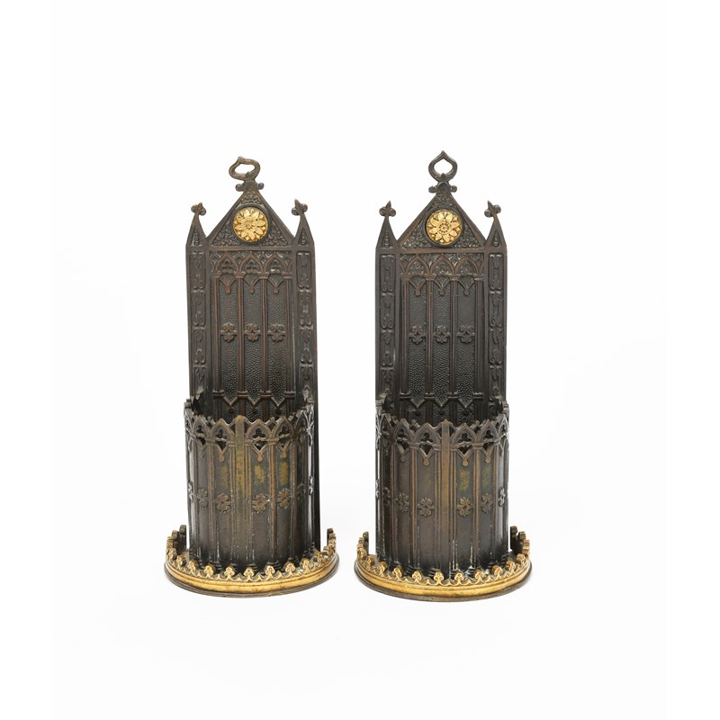 A pair of reformed Gothic patinated metal spill vases, hemispherical section, cast in low relief with tracery, unsigned, 17cm. high, (2)