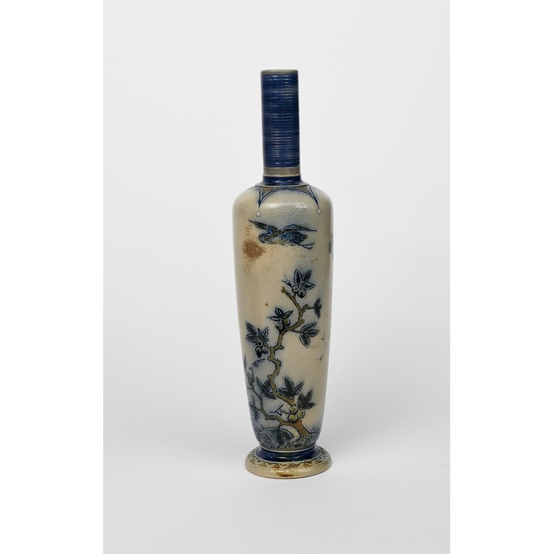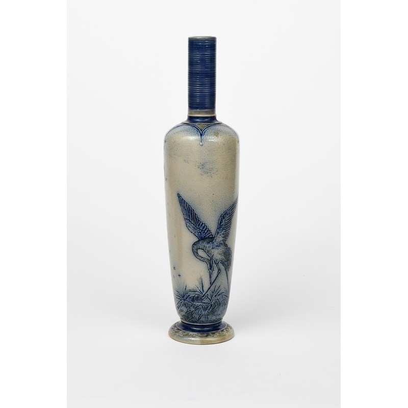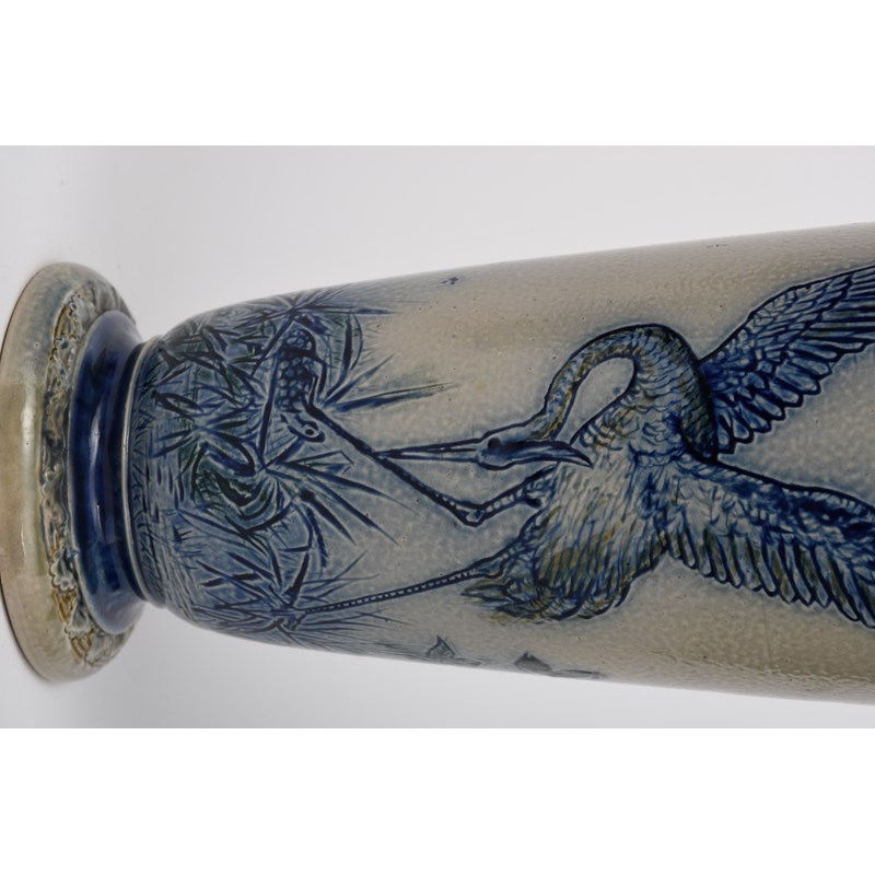 An early Martin Brothers stoneware vase by Robert Wallace Martin, dated 1873, slender, shouldered form, incised with a crane trapping a tortoise under its foot, amongst foliage, the reverse with a fruiting apple tree and two cranes flying, incised 10 R W Martin Southall, 3-1873, restored, 44.5cm. high