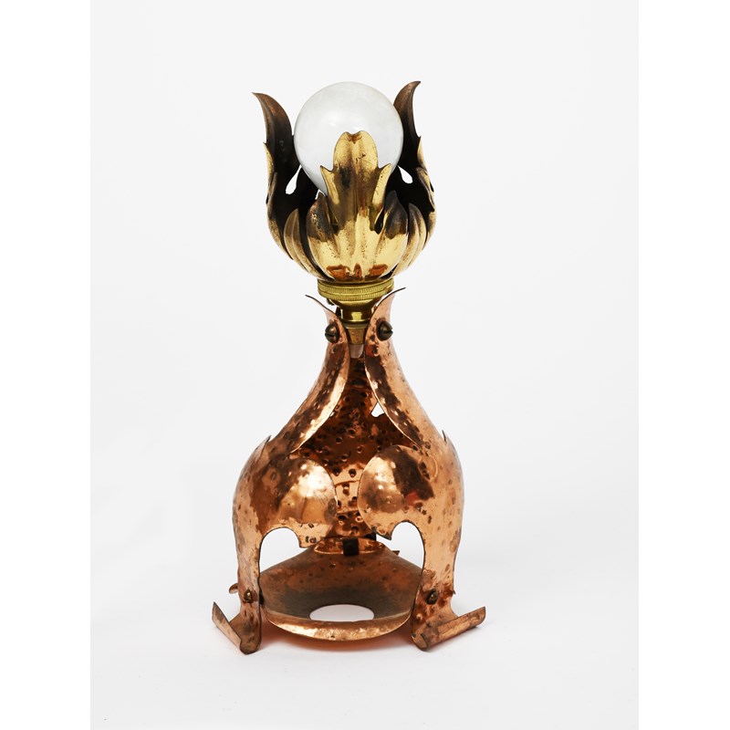 A copper and brass lamp in the manner of WAS Benson, foliate form, unsigned, 22.5cm. high