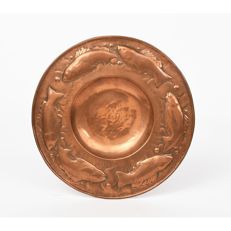 A Keswick School of Industrial Arts copper bowl, the shallow hammered bowl with three angular handles terminating with heart-shaped feet, a copper plate hammered in relief with scaly fish probably Newlyn and a copper single-handled stein in the manner of Yattendon, stamped KSIA mark to bowl, 22cm. diam. (bowl), (3)