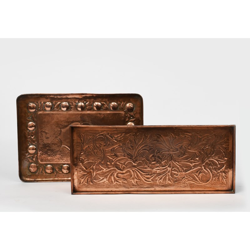 A Keswick School of Industrial Arts copper tray, rectangular with raised rim, scrolling foliage, design, and a copper tray probably Newlyn, hammered in low relief with a border of fruit and foliage, main tray stamped KSIA, 60.5 x 25.5cm. (2)