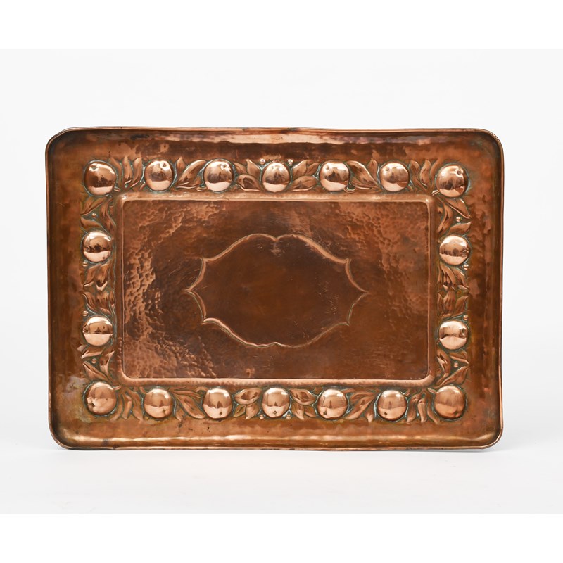 A Keswick School of Industrial Arts copper tray, rectangular with raised rim, scrolling foliage,