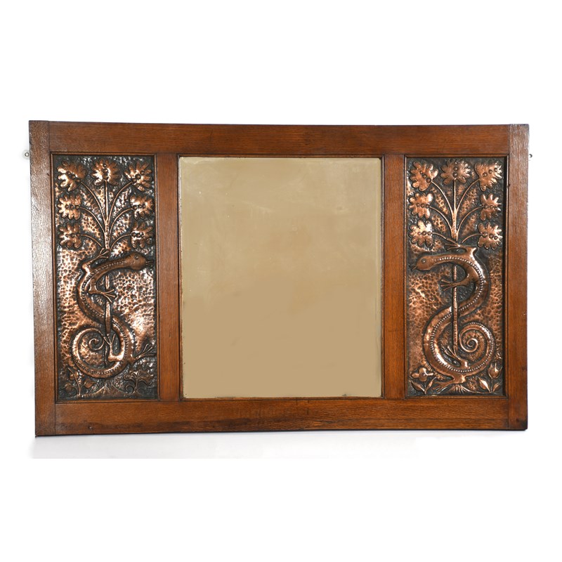 A large and impressive John Pearson oak and repousse copper wall mirror, rectangular, oak frame with central bevelled glass mirror, flanked with two repousse copper panels each hammered in deep relief depicting a gecko climbing a stylised branch, above simple flower and foliage motif, stamped signature and date visible to left hand panel 122 x 76cm, 59 x 24cm (panels)