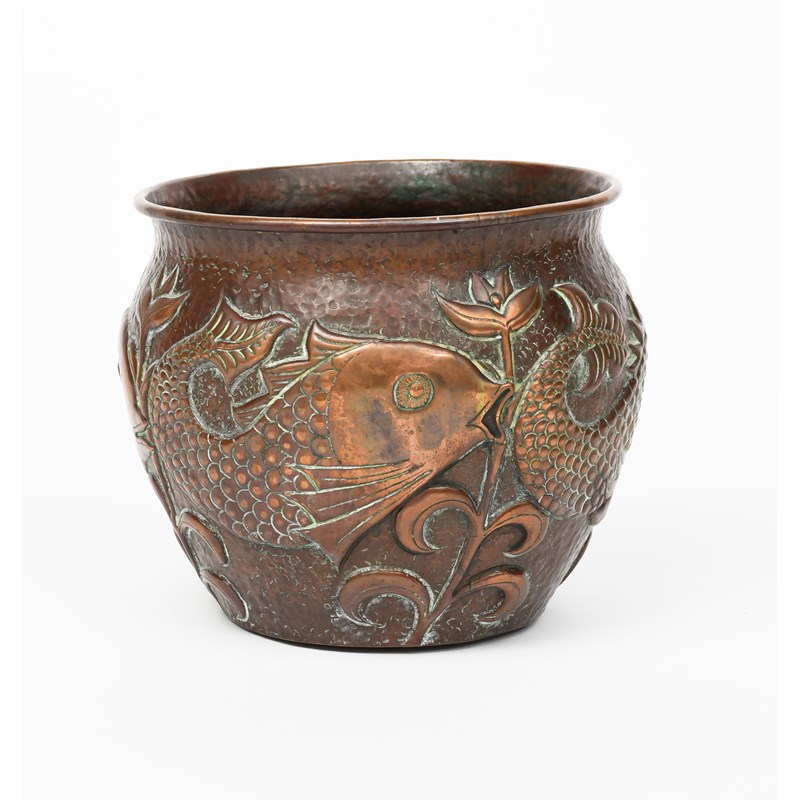 A repousse copper jardiniere by John Pearson, dated 1900, shouldered form, hammered in high relief with a frieze of scale fish and waterweed, stamped marks, 21cm. high