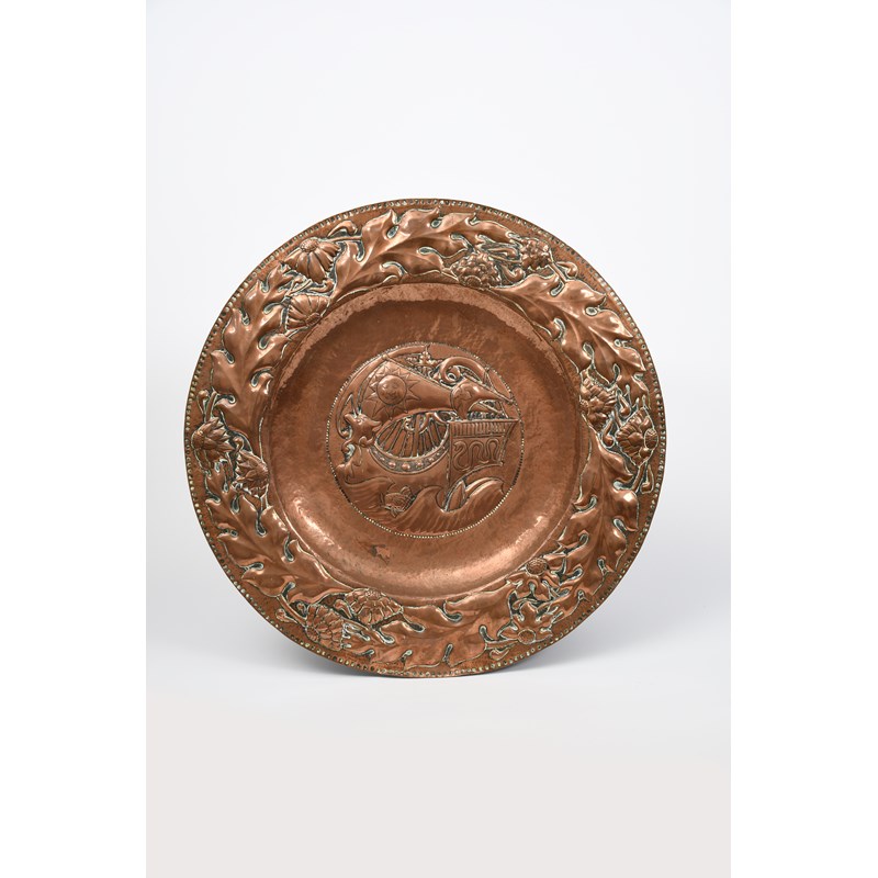 A large repousse copper charger probably by John Pearson, hammered to the well with a galleon at