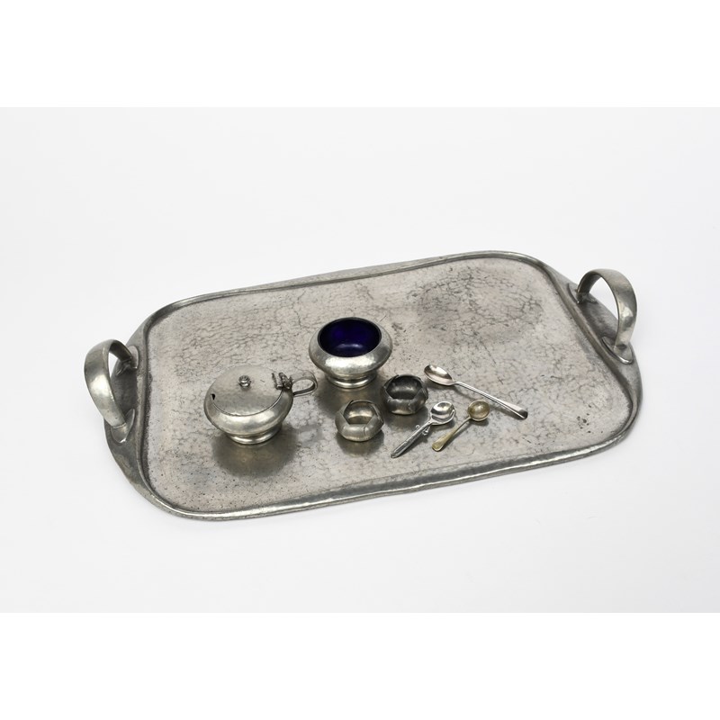 A Liberty & Co Tudric pewter tray designed by Archibald Knox, model no.043, rounded rectangular form, cast with strap handles, a Liberty Tudric pewter salt and mustard pot, with blue glass liners, a pewter spoon, two smaller pewter salts and two matched spoons, stamped marks to Tray and both pots, 47cm wide (tray), (8)